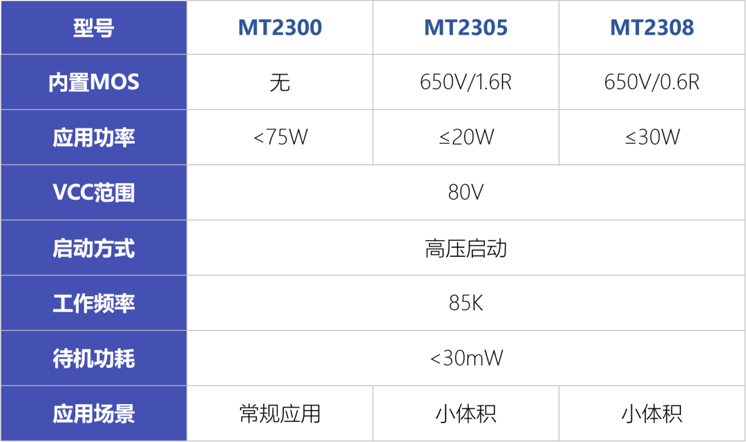 MT2300系列 SSR控制器驅(qū)動(dòng)Si MOS,VCC耐壓達(dá)80V,無(wú)需外部添加LDO,降低系統(tǒng)成本。工作頻率85KHz,支持高壓?jiǎn)?dòng),待機(jī)功耗低于30mW。MT2305和MT2308內(nèi)置Si MOS,進(jìn)一步縮小PCB面積,利于小型化設(shè)計(jì)。于小型化設(shè)計(jì)。