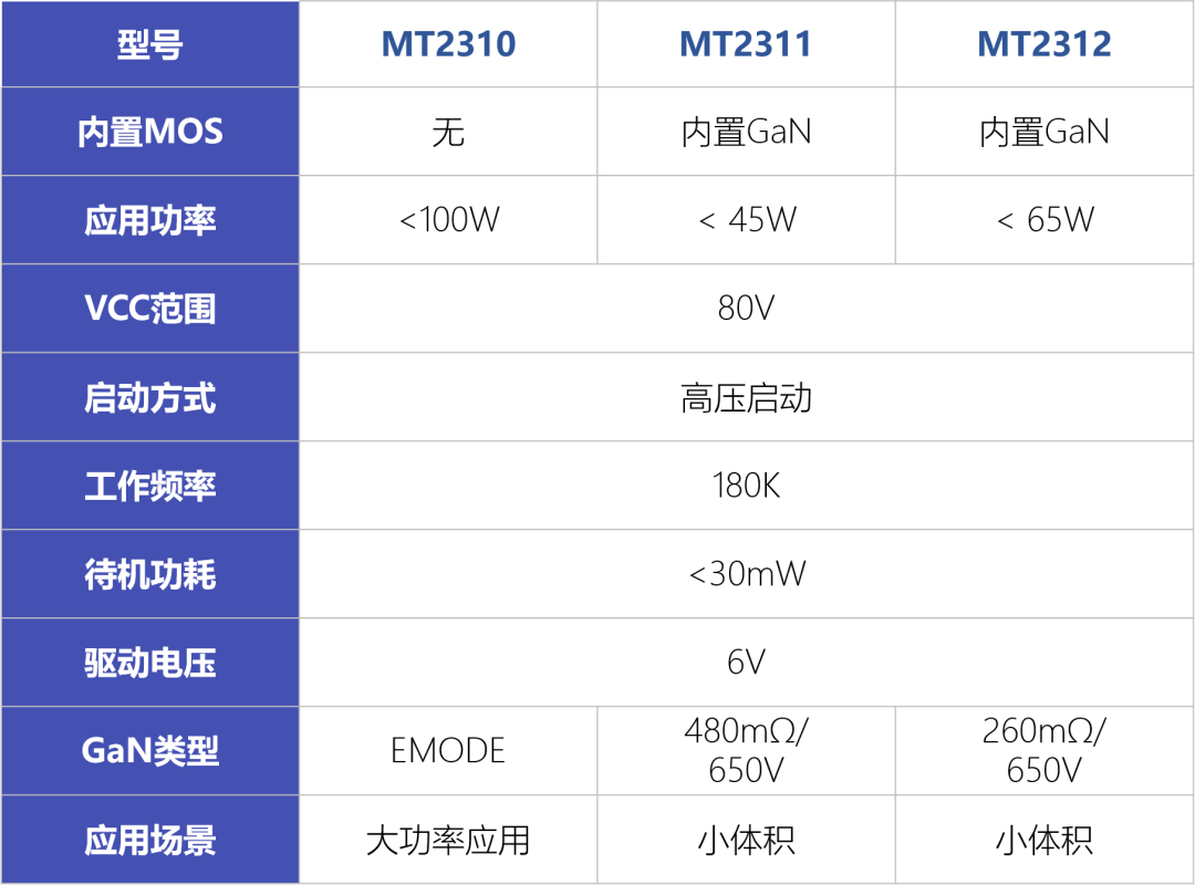 MT2310系列SSR控制器驅(qū)動(dòng)GaN功率管,VCC耐壓達(dá)80V,無(wú)需外部LDO,降低系統(tǒng)成本。工作頻率高達(dá)180KHz,內(nèi)部高壓?jiǎn)?dòng)使待機(jī)功耗低于30mW。MT2311和MT2312內(nèi)置GaN功率管,可用于小體積使用場(chǎng)景。