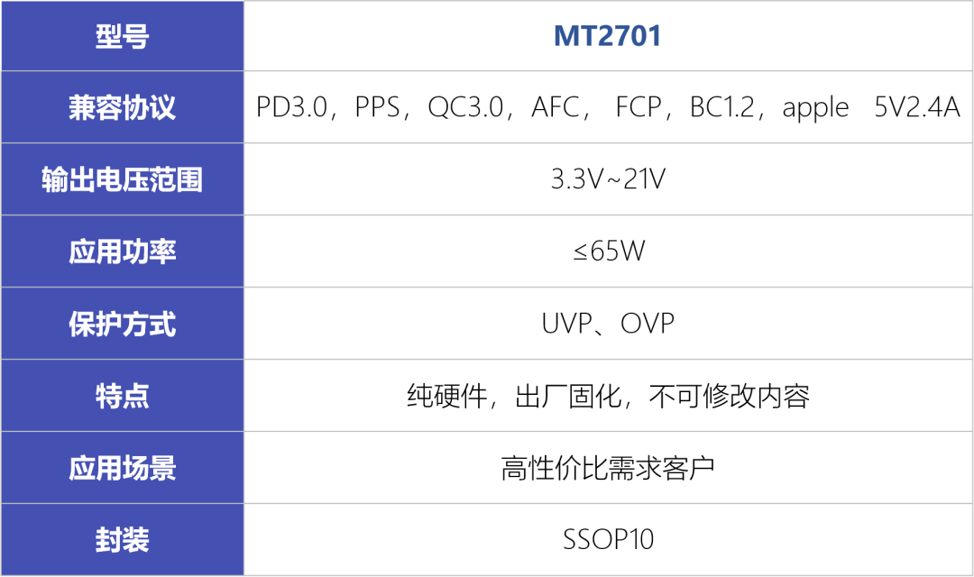 美芯晟開(kāi)發(fā)的快充協(xié)議芯片包括MT2701和最新的MT280X系列,芯片兼容多種快充協(xié)議。MT2701支持65W以內(nèi)應(yīng)用,兼容PD3.0,PPS,QC2,QC3,AFC,F(xiàn)CP,私有協(xié)議低壓直充5V4.5A,Apple 5V2.4A,BC1.2等常用協(xié)議。MT2701采用純硬件架構(gòu),通過(guò)外部元件來(lái)調(diào)節(jié)輸出功率段,應(yīng)用簡(jiǎn)單,BOM成本低,適合不需要USB-IF認(rèn)證的客戶。