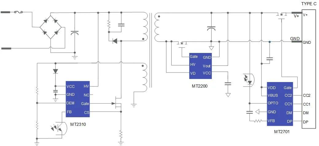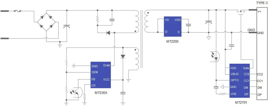 65W以內(nèi)合封 Si MOS/GaN功率管整體方案典型應(yīng)用如上圖所示。配套使用的快充協(xié)議芯片是兼容多協(xié)議的MT2701,合封式方案利于客戶將產(chǎn)品小型化。