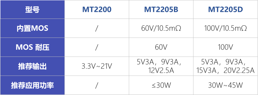 MT2200可輸出3.3V~21V,滿足USB PPS寬電壓輸出要求。MT2205內(nèi)置Si MOS,利于小型化設(shè)計(jì)。