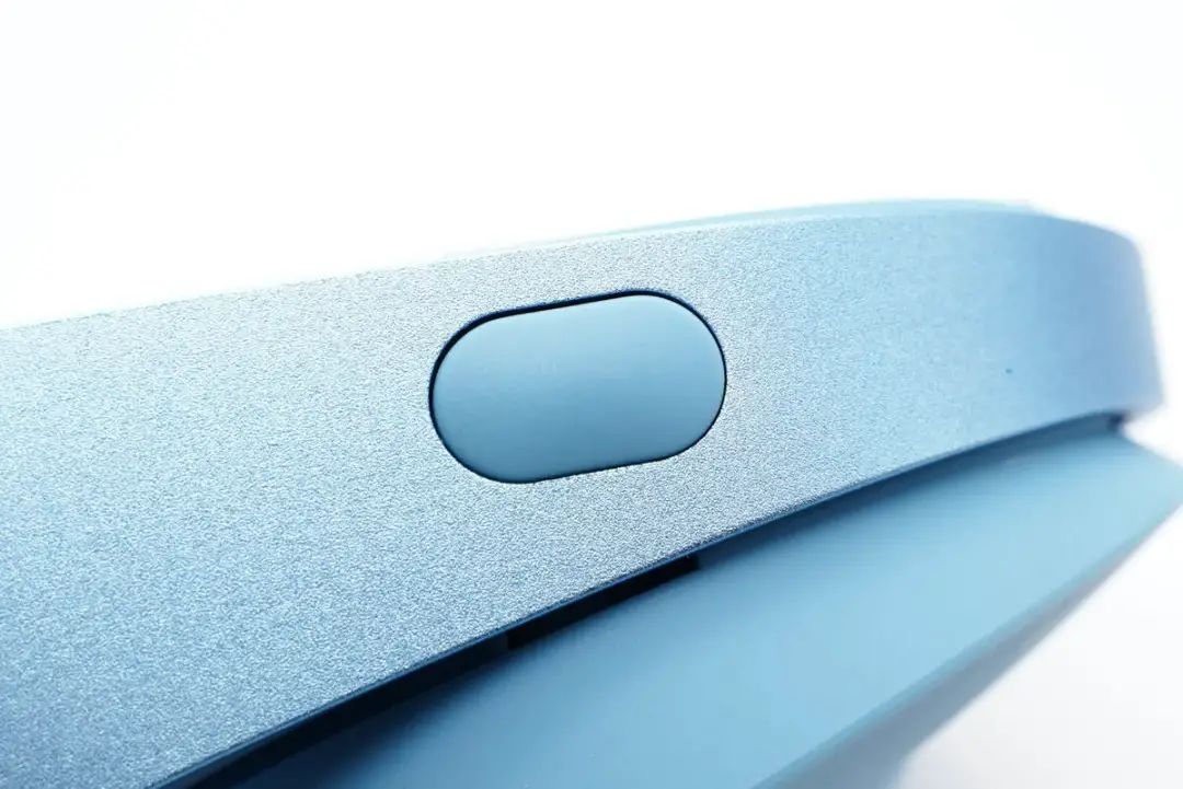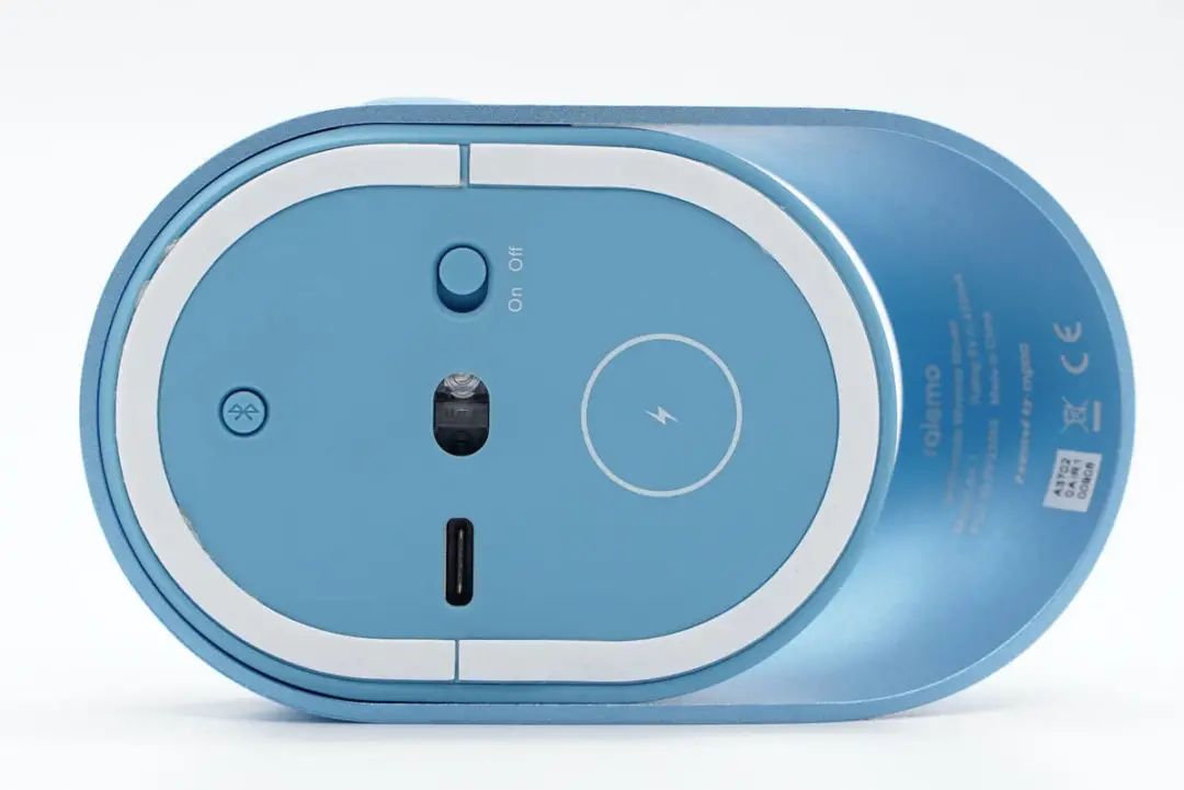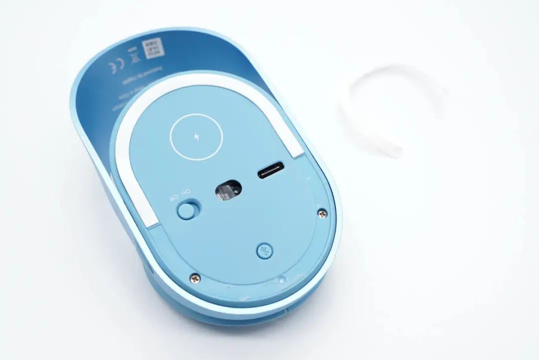 鼠標(biāo)底部邊緣貼有白色聚四氟乙烯腳墊,兩端分別是藍(lán)牙鍵和無線充電標(biāo)識(shí),兩側(cè)是USB-C充電口和電源鍵。