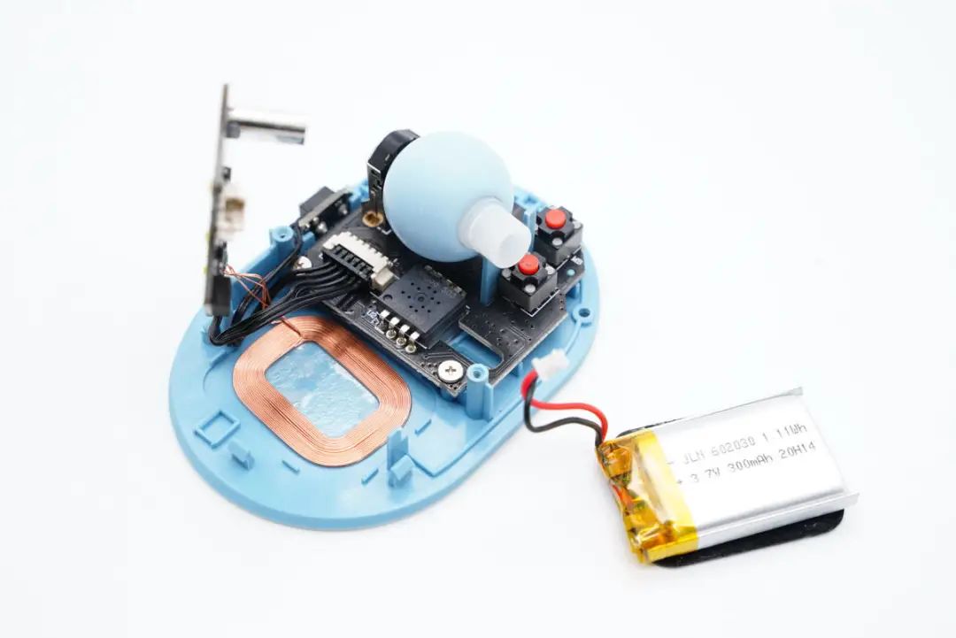 兩塊小板之間也是通過導(dǎo)線插拔式連接,無線充電線圈使用雙面膠粘貼在底板上。