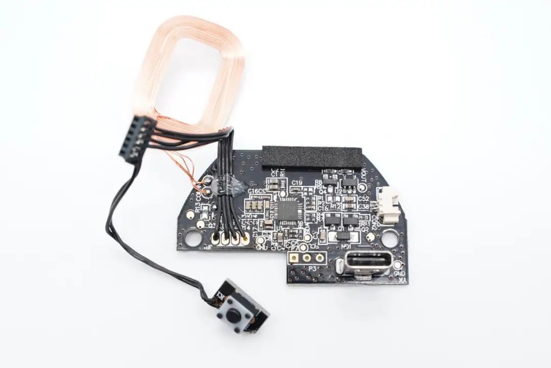 小板正面一覽,垂直焊接USB-C輸入母座,右側(cè)是電池插座,左側(cè)連接導(dǎo)線和無線充電線圈,中心是無線充電接收芯片。