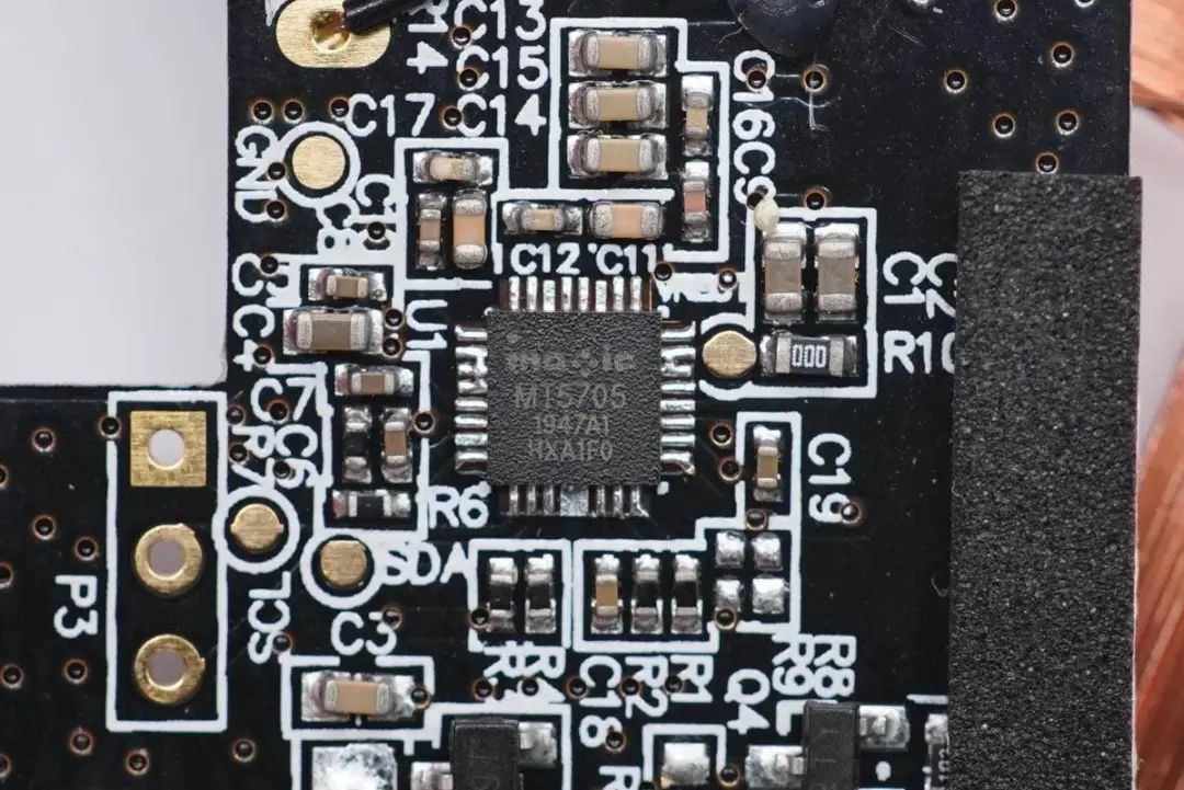 無線充電接收芯片采用美芯晟MT5705,上方三顆諧振電容并聯(lián)。MT5705是一款基于磁感應(yīng)的無線充電接收器的SoC(片上系統(tǒng)),采用嵌入式ARM Cortex M0處理器,2KB SRAM, 8KB OTP,完全符合BPP的最新WPC Qi規(guī)范(版本1.2.4)。