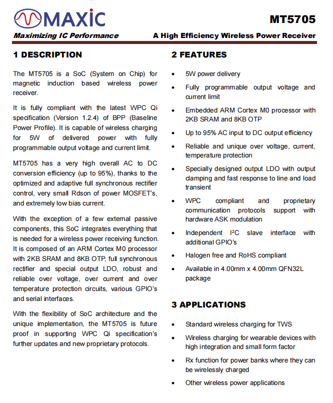 MT5705可提供穩(wěn)定的5W輸出功率,支持輸出電壓5V和電流最大1A,AC to DC轉(zhuǎn)換效率達(dá)95%;其擁有完善的過壓、過流、過溫保護(hù)機(jī)制,獨(dú)立的I2C通信接口和豐富的GPIO。封裝為4.00mm x 4.00mm QFN32L,尤其適合TWS耳機(jī)充電倉等各類小功率智能設(shè)備。