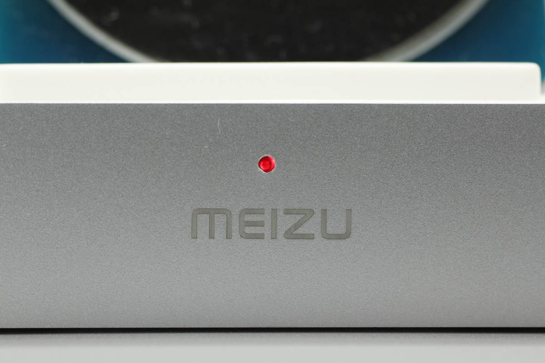 底座前端印有MEIZU品牌,并設(shè)有一顆LED充電指示燈。