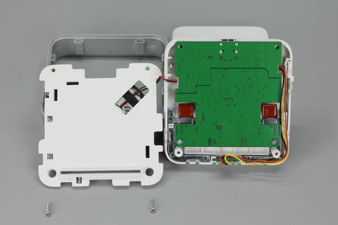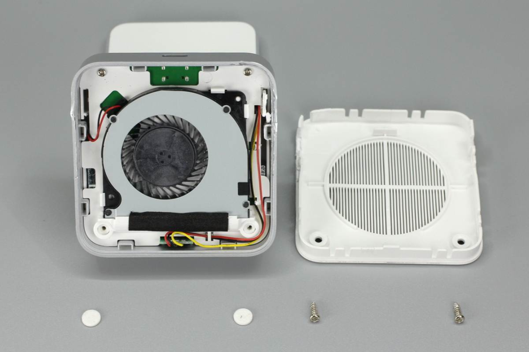 拆掉兩顆螺絲即可將底部外殼打開(kāi),風(fēng)扇使用卡扣進(jìn)行固定,并且風(fēng)扇和PCB板間有一塊白色塑料板進(jìn)行隔離。