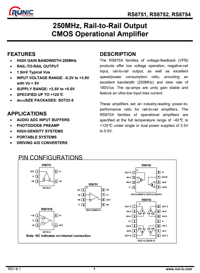 潤(rùn)石 RS8751 單運(yùn)放,用于信號(hào)處理。