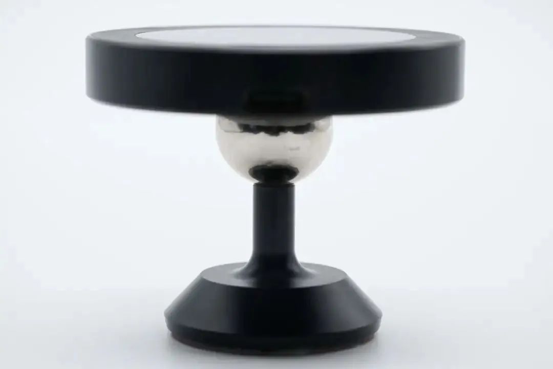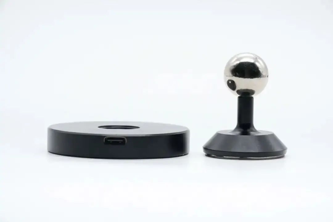 This magnetic wireless charger is composed of two parts: a pillar with a spherical top and a disc-shaped wireless charging board. After magnetic attraction, the charger board supports all rotation angle, making it convenient for users. The pillar base is equipped with a USB-C interface. The diameter of the charging board is 60.02mm, and thickness is 9.73mm.