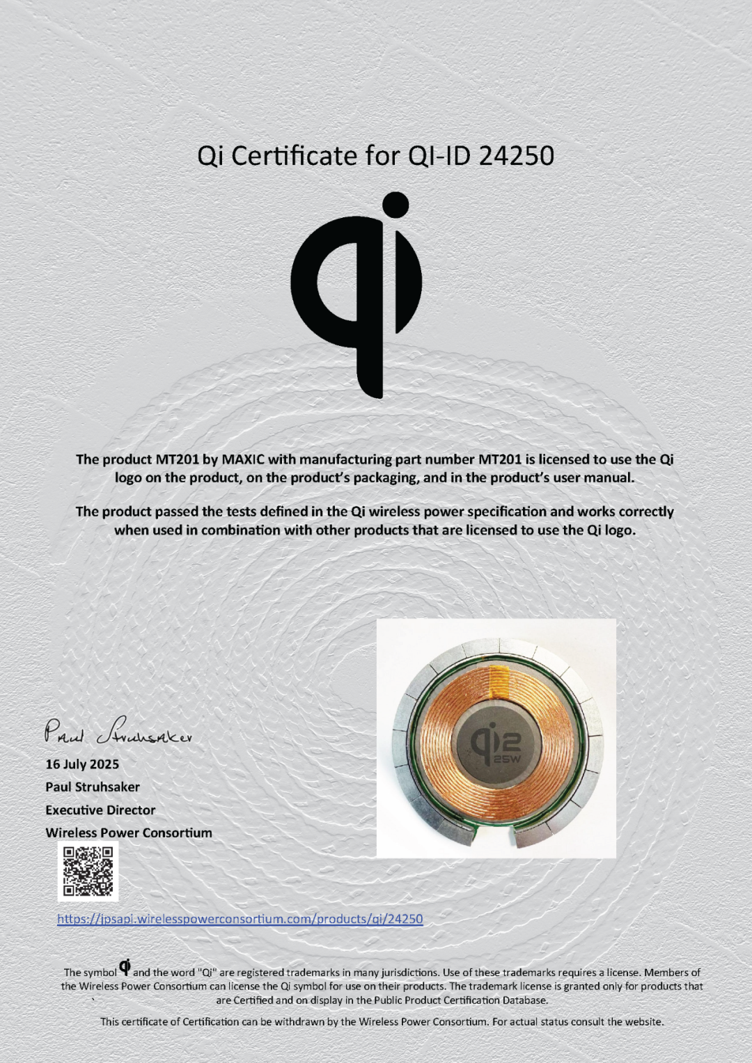 美芯晟自主研發(fā)的無線充電發(fā)射端模組已通過最新的Qi2.2.1認證,Qi認證ID為24250,料號為MT201,Qi無線充電功率達25W(MPP25),內(nèi)置美芯晟一芯多充無線充電發(fā)射端芯片MT5820,支持BPP、EPP和MPP(5W/15W/25W)三種功率配置。
