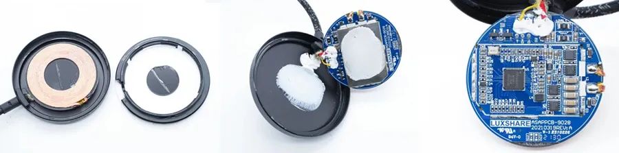首先沿?zé)o線充外殼接縫撬開(kāi)外殼,鋁合金外殼內(nèi)部是無(wú)線充驅(qū)動(dòng)電路以及線圈,白色面板固定在塑料支架上,與鋁合金外殼之間通過(guò)卡扣固定。電路板背面焊接屏蔽罩,屏蔽罩使用膠水固定在無(wú)線充電器外殼內(nèi)部。無(wú)線充內(nèi)置一塊圓形電路板,上方焊接輸入U(xiǎn)SB-C導(dǎo)線,右側(cè)焊接無(wú)線充電線圈,下方為指示燈焊盤,預(yù)留有指示燈的位置。