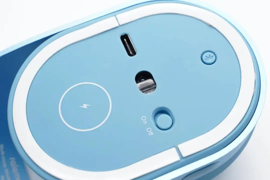 鼠標(biāo)底部邊緣貼有白色聚四氟乙烯腳墊,兩端分別是藍(lán)牙鍵和無線充電標(biāo)識(shí),兩側(cè)是USB-C充電口和電源鍵。