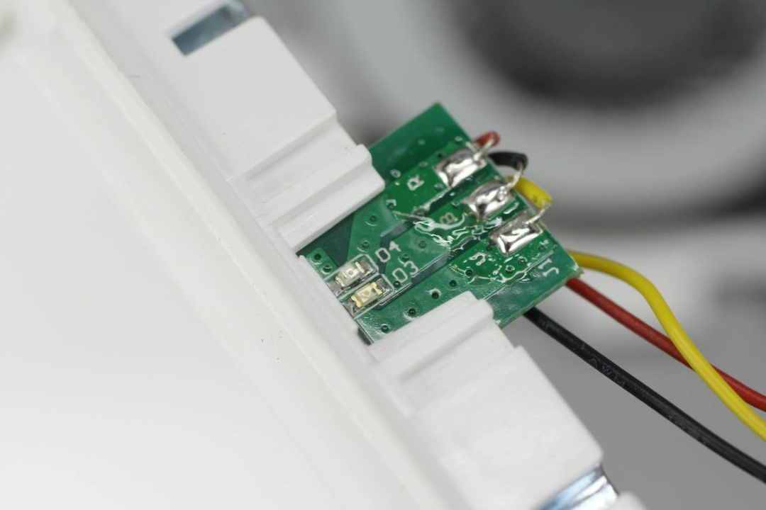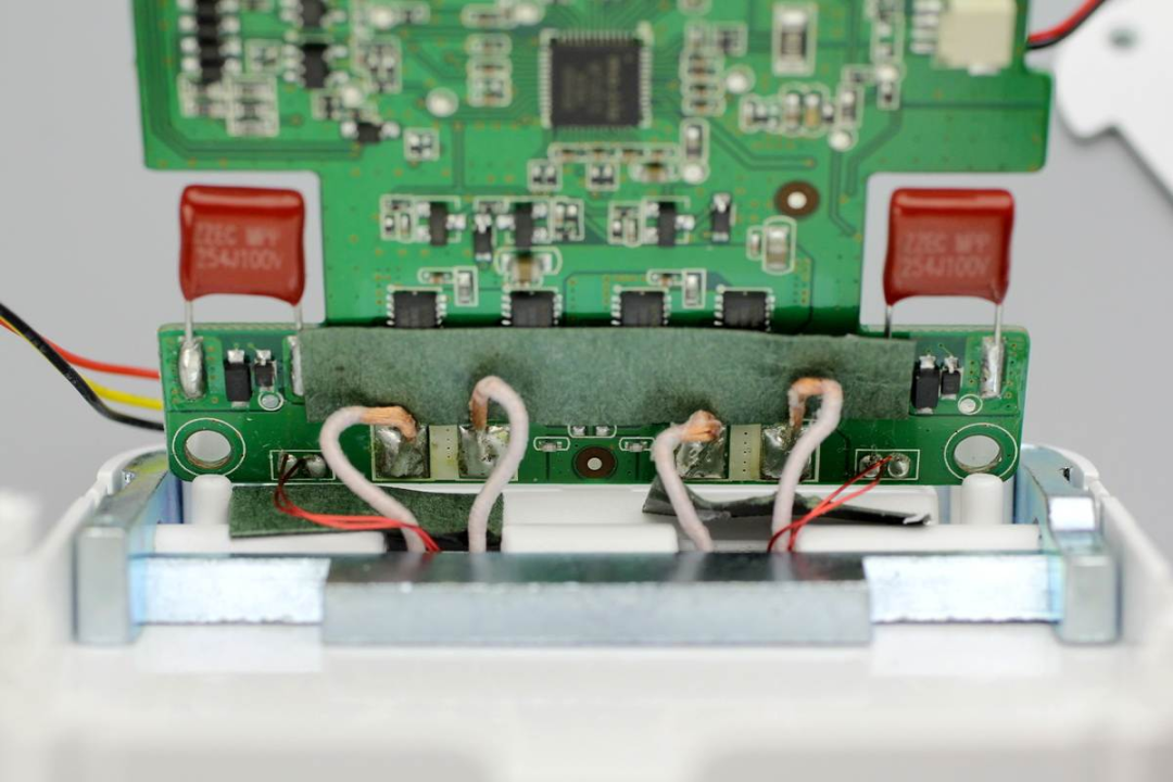 拆掉兩顆螺絲即可將底部外殼打開(kāi),風(fēng)扇使用卡扣進(jìn)行固定,并且風(fēng)扇和PCB板間有一塊白色塑料板進(jìn)行隔離。